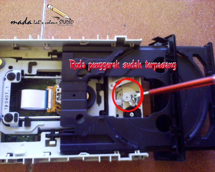 Untuk mengatasi masalah belt penggerak yang sudah longgar cukup menggantinya saja, beli di toko elektronik,jangan lupa bawa contohnya untuk pembanding ukuranya.apabila tidak ada ukuran belt penggerak yang sama persis,karena biasanya di toko elektronik hanya menyediakan ukuran untuk vcd/dvd player yang lebih longgar sedikit dibanding dengan aslinya,maka roda penggerak yang menempel di dinamo harus di ganti juga dengan ukuran yang lebih besar, agar belt tidak longgar.
