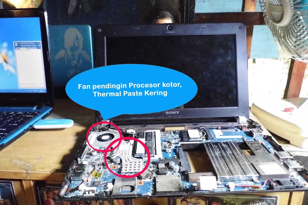 Dimintai tolong seorang temen seperjuangan waktu kuliah dulu, buat benerin timangan kotaknya (netbook), yang akhir-akhir ini katanya semakin rewel,ga mau di ajakin buat nyari duit :).Yang sering di keluhkan kondisi si kotak ini tuh lemot sekali, benar saja waktu ane coba di rumah temen ane memang nih netbook lemotnya minta ampun. setelah start up berjalan antivirus bekerja dan membuat si prosesor pusing, di tandai dengan grafik prosesor yang naik dDian berhenti di level 100% dan ga mau turun. Di saat ane shut down terdengar suara aneh dari fan prosesornya seperti suara tersendatnya putaran fan karena ada benda yang menghalangi putaranya. karena ane pikir ini butuh penanganan yang cukup lumayan, ane minta ijin nih netbook ane operasi di rumah ane. :D